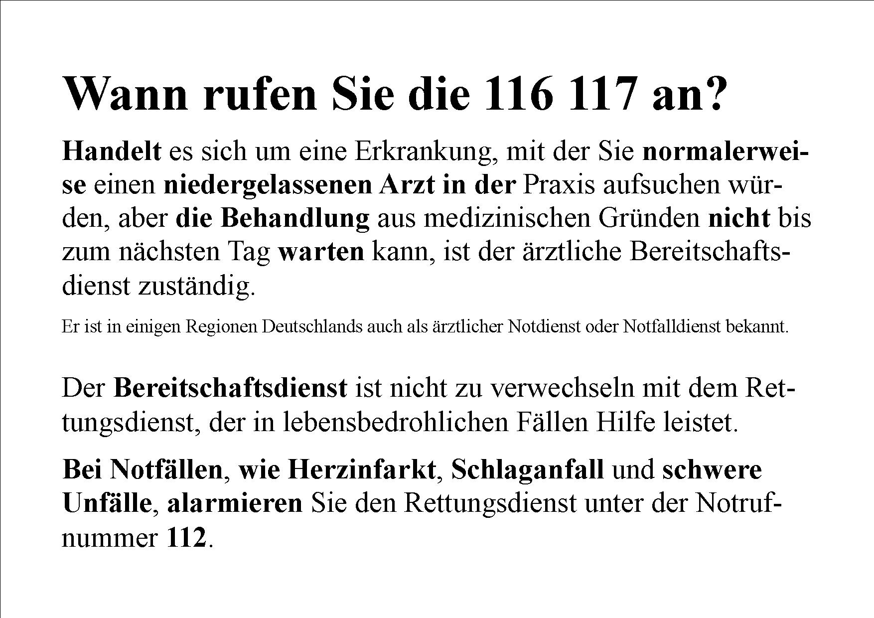 - Wofür?: Diese Nummer ist für den ärztlichen Bereitschaftsdienst, wenn kein akuter Notfall vorliegt, aber dennoch medizinische Hilfe notwendig ist.